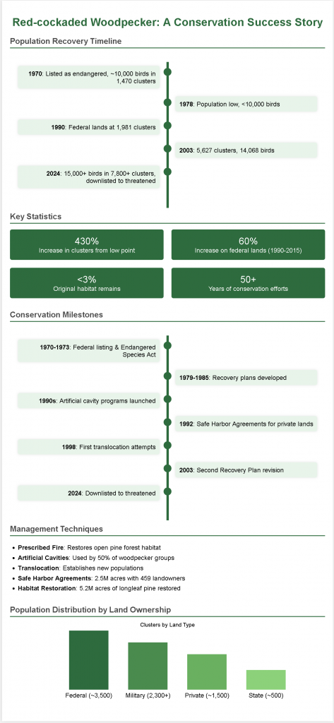 After 54 years on the endangered species list, the Red-cockaded Woodpecker (RCW) in Texas stands as a living emblem of hope for modern conservation. In the dense, ancient forests of the East Texas Pineywoods, recovery efforts have reversed decades of decline for this small black-and-white bird, symbolizing one of America’s greatest comeback stories. In 2024, the RCW was officially “downlisted” from endangered to threatened—a remarkable turnaround driven by the perseverance of Texas conservationists, scientists, and local communities.