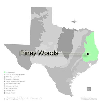 The East Texas Pineywoods encompass a vast, humid region covering 23,500 square miles—making up much of Texas’s green eastern border. With a subtropical, high-rainfall climate (35–60 inches annually), this ecoregion represents the western extension of southern U.S. pine forests, historically famed for their towering longleaf, slash, shortleaf, and loblolly pines.
